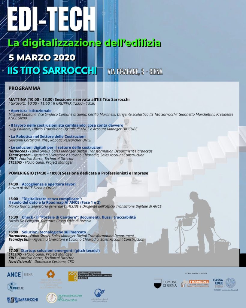ANCE Siena, in collaborazione con gli ordini professionali di settore ed il dipartimento DIHCUBE di ANCE e con il patrocinio del Comune di Siena, della Cassa Edile di Siena e di FORMEDILSIENA Scuola Edile – Formazione e Sicurezza, organizza il convegno EDI-TECH, La digitalizzazione dell’edilizia.